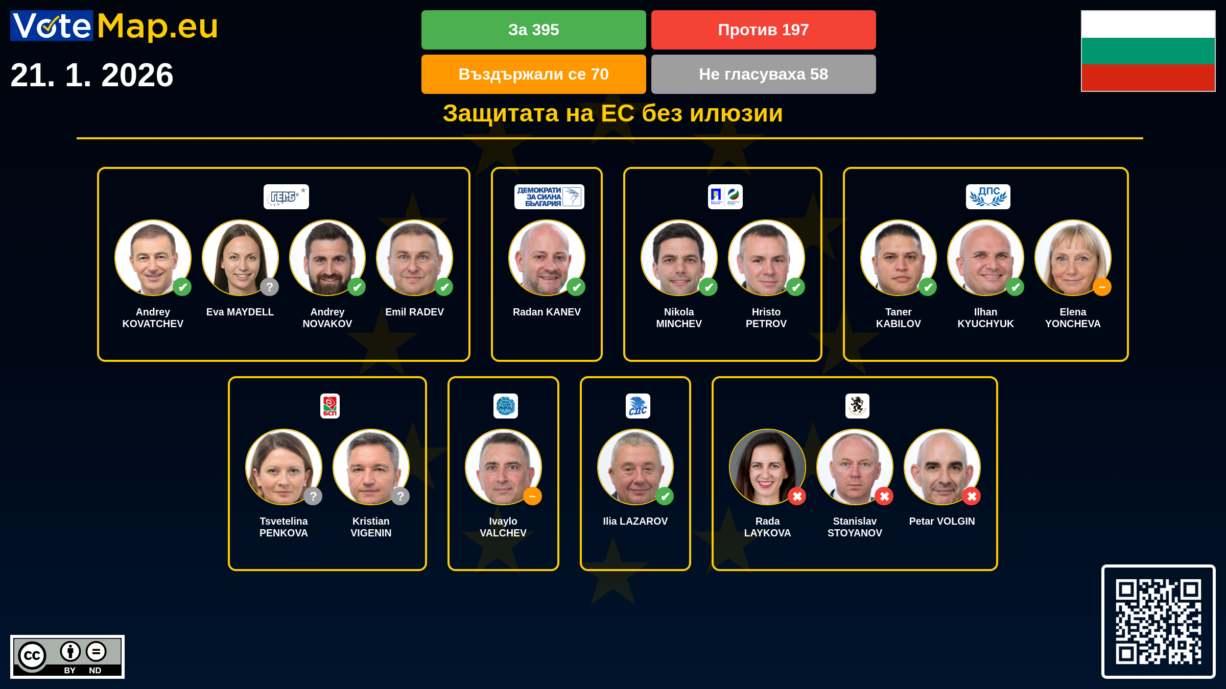 We collect and visually present data publicly available at the page of European Parliament. Votemap.eu denies any responsibility for possible inconsistencies of the data or its changes after the publication.