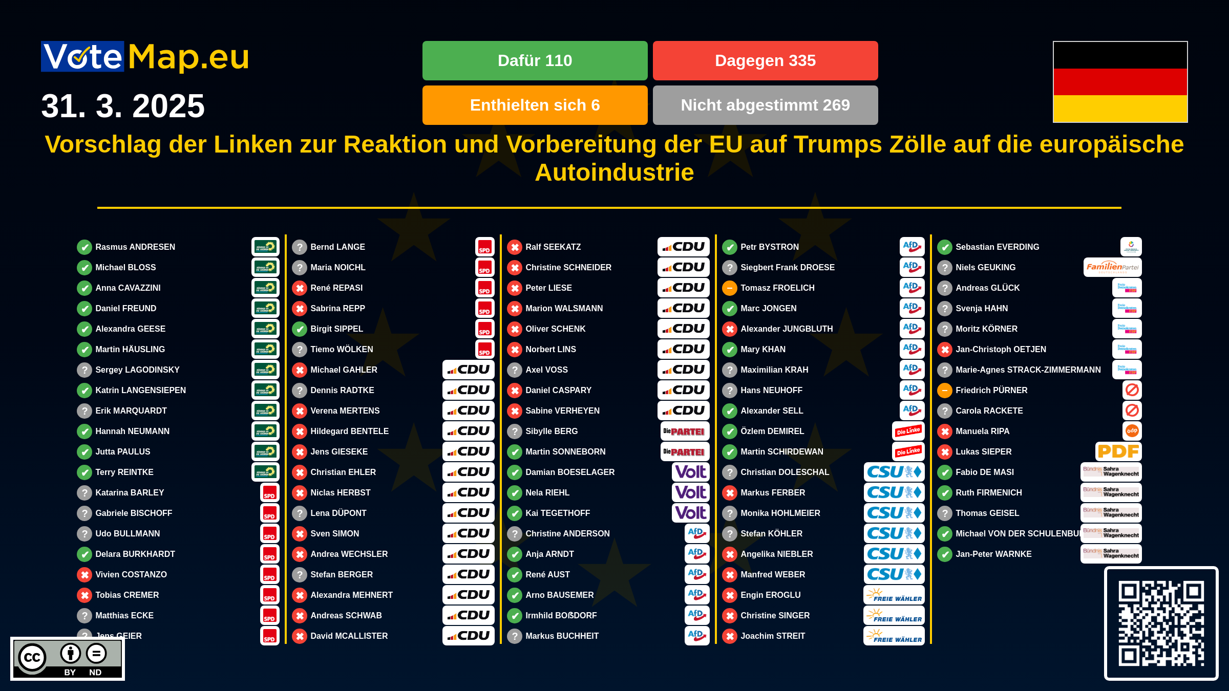 Das Europäische Parlament hat heute bei der Annahme der Tagesordnung für die Plenarwoche einen Antrag der Linksfraktion (Die Linke) nicht angenommen. In dem Antrag wurde die Europäische Kommission aufgefordert, eine ausführliche Erklärung über die Vorbereitungen und die Reaktion der Europäischen Union auf die von der Regierung von Präsident Donald Trump angekündigten Zölle von 25 % auf US-Autoimporte mit Wirkung vom 2. April 2025 abzugeben.