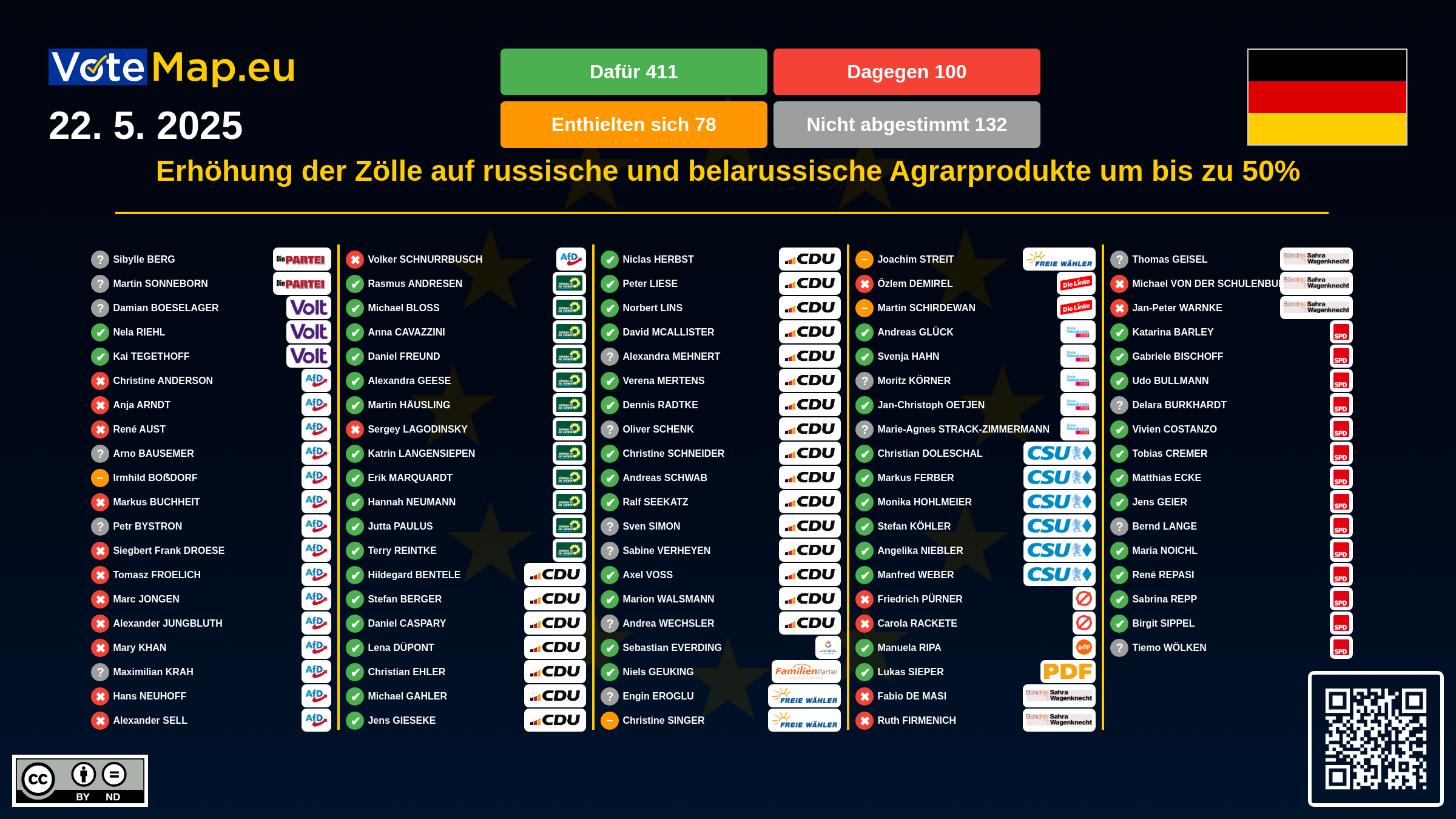 We collect and visually present data publicly available at the page of European Parliament. Votemap.eu denies any responsibility for possible inconsistencies of the data or its changes after the publication.