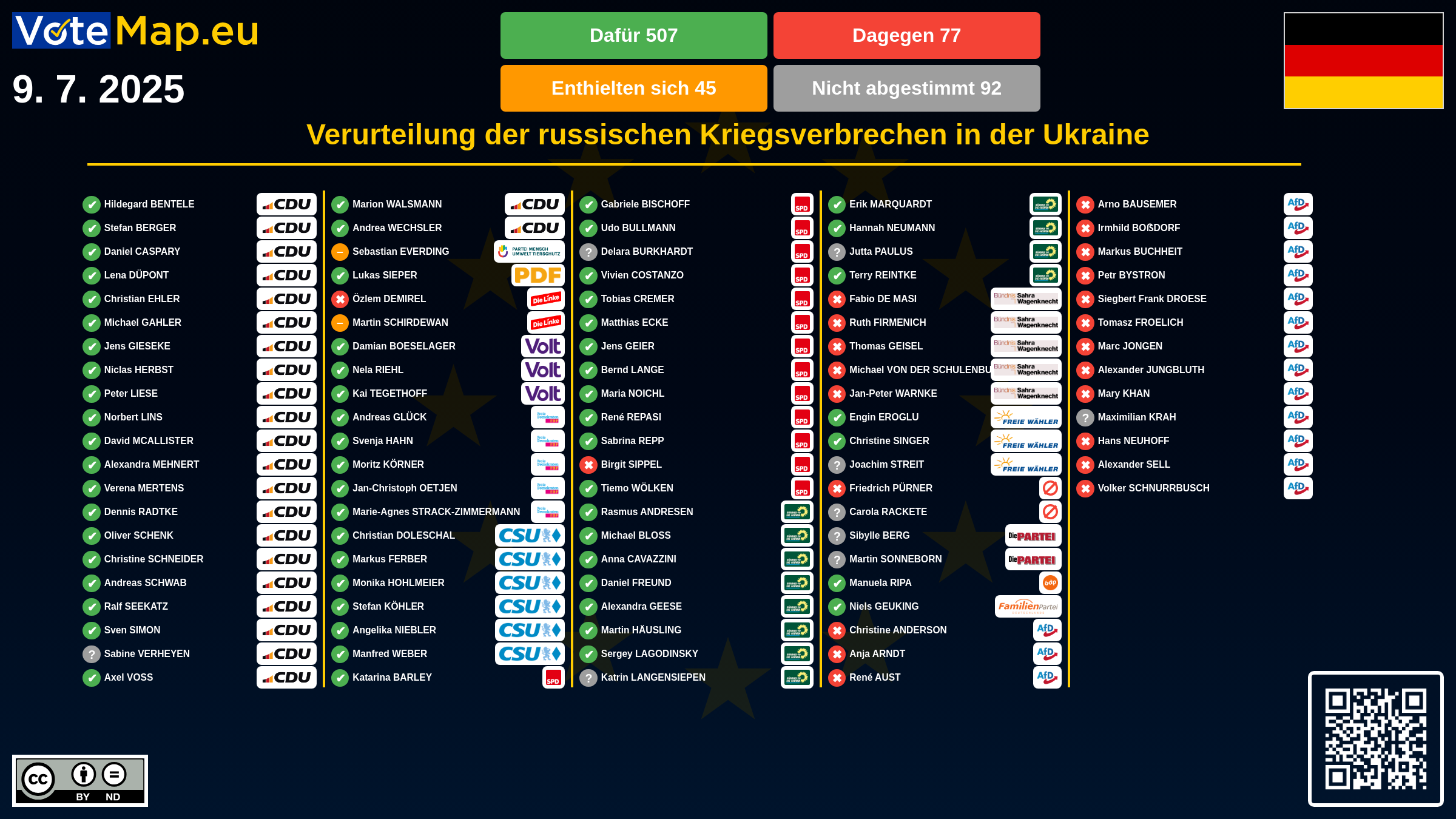We collect and visually present data publicly available at the page of European Parliament. Votemap.eu denies any responsibility for possible inconsistencies of the data or its changes after the publication.
