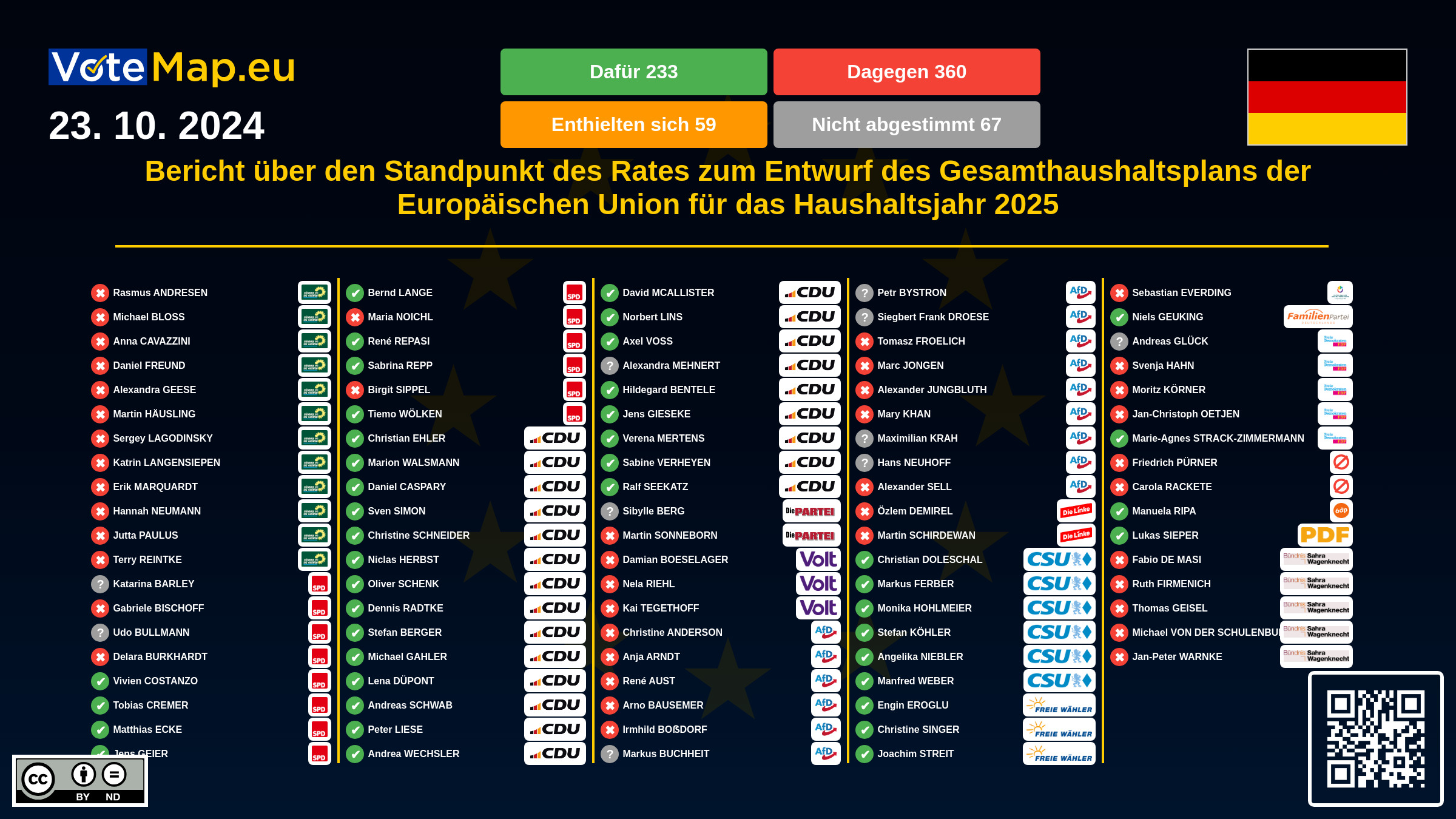 We collect and visually present data publicly available at the page of European Parliament. Votemap.eu denies any responsibility for possible inconsistencies of the data or its changes after the publication.