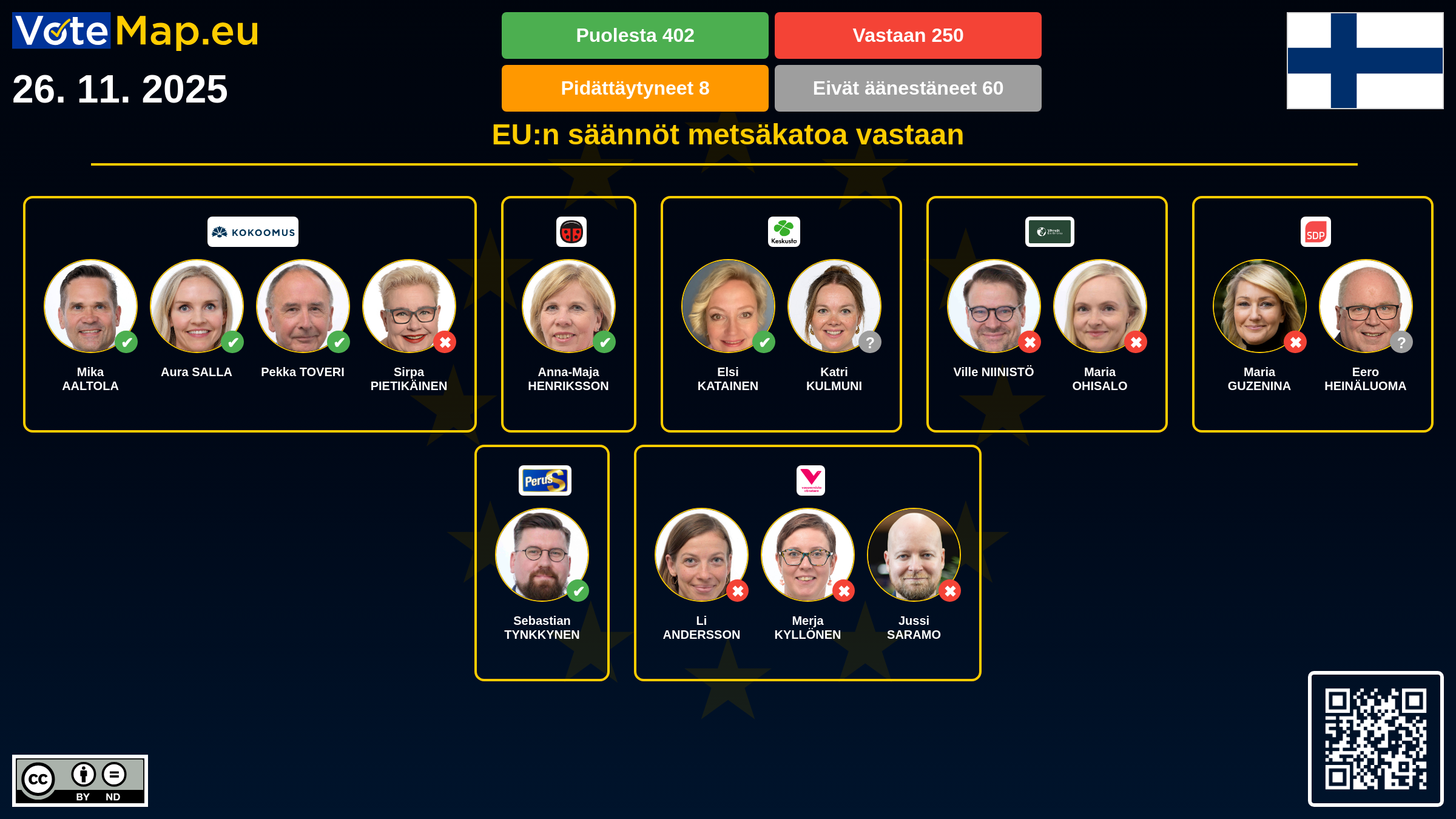 We collect and visually present data publicly available at the page of European Parliament. Votemap.eu denies any responsibility for possible inconsistencies of the data or its changes after the publication.