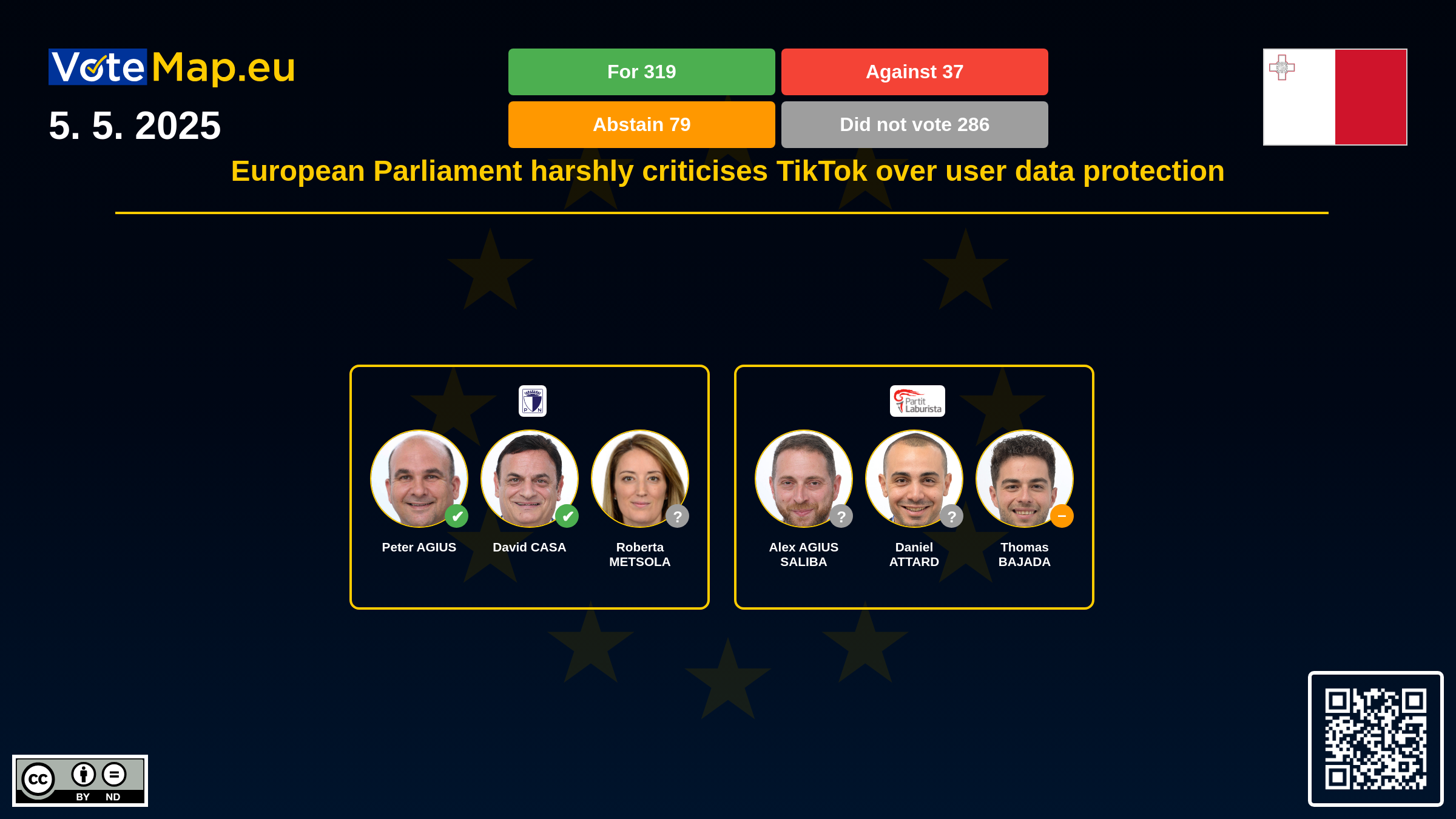 We collect and visually present data publicly available at the page of European Parliament. Votemap.eu denies any responsibility for possible inconsistencies of the data or its changes after the publication.