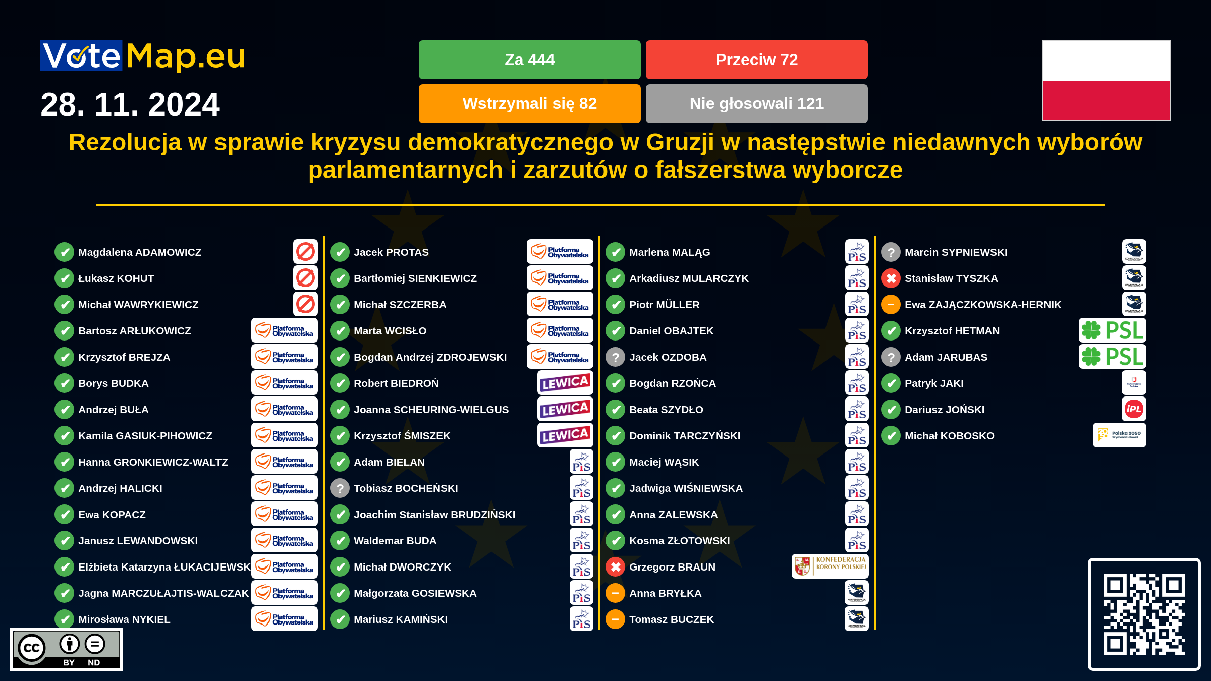 Rezolucja podkreśla nieproporcjonalne represje wobec działaczy prodemokratycznych i polityków opozycji, którzy są kryminalizowani i zastraszani przez gruziński rząd. Posłowie ostrzegli, że działania te odwracają Gruzję od jej proeuropejskiego kierunku i zbliżają ją do praktyk autorytarnych.
