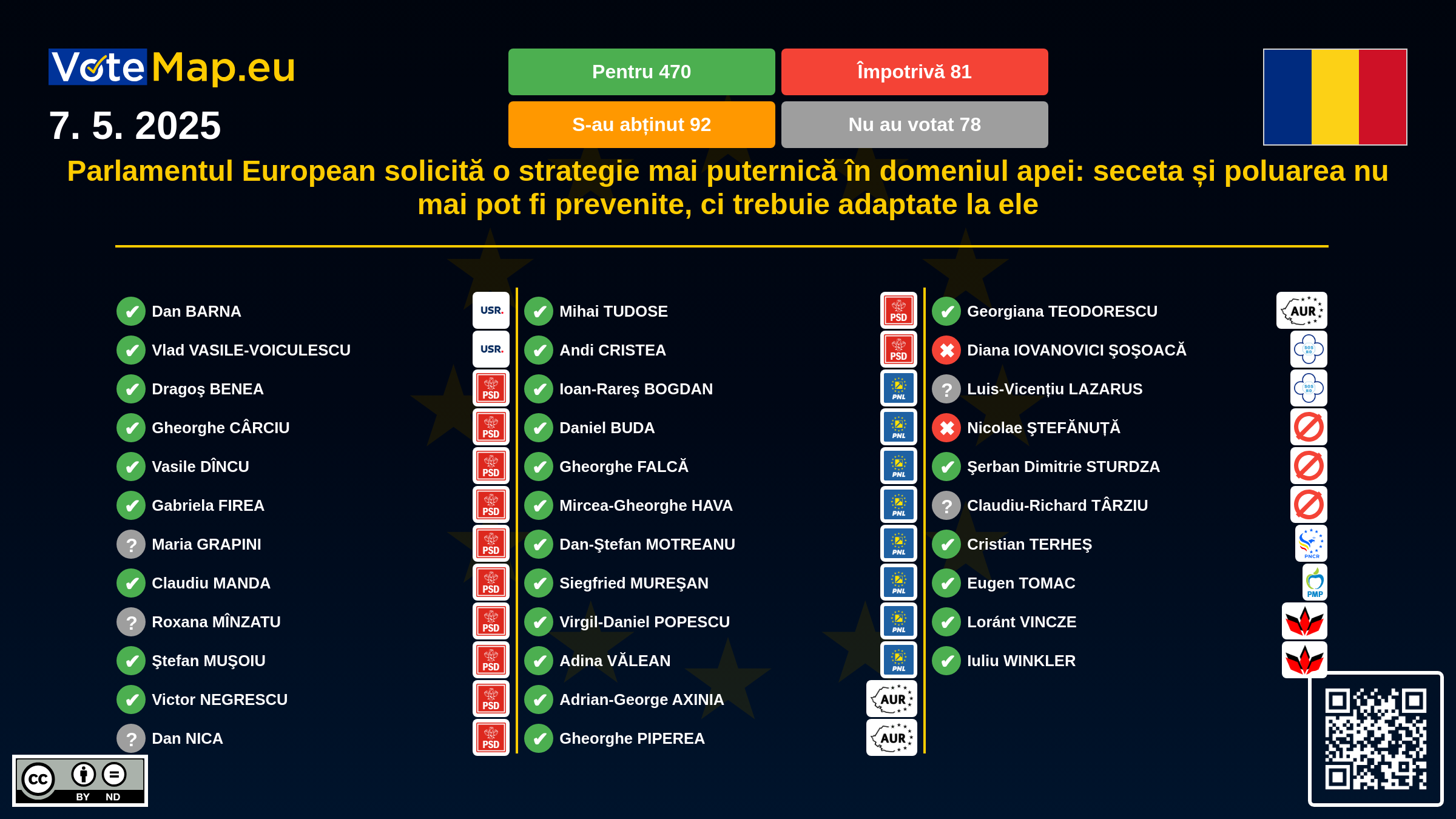 Joi, Parlamentul European a adoptat o rezoluție care solicită un cadru unic pentru reziliența apei. Scopul este de a îmbunătăți disponibilitatea apei, protejând-o de suprapoluare, poluare și impactul schimbărilor climatice.