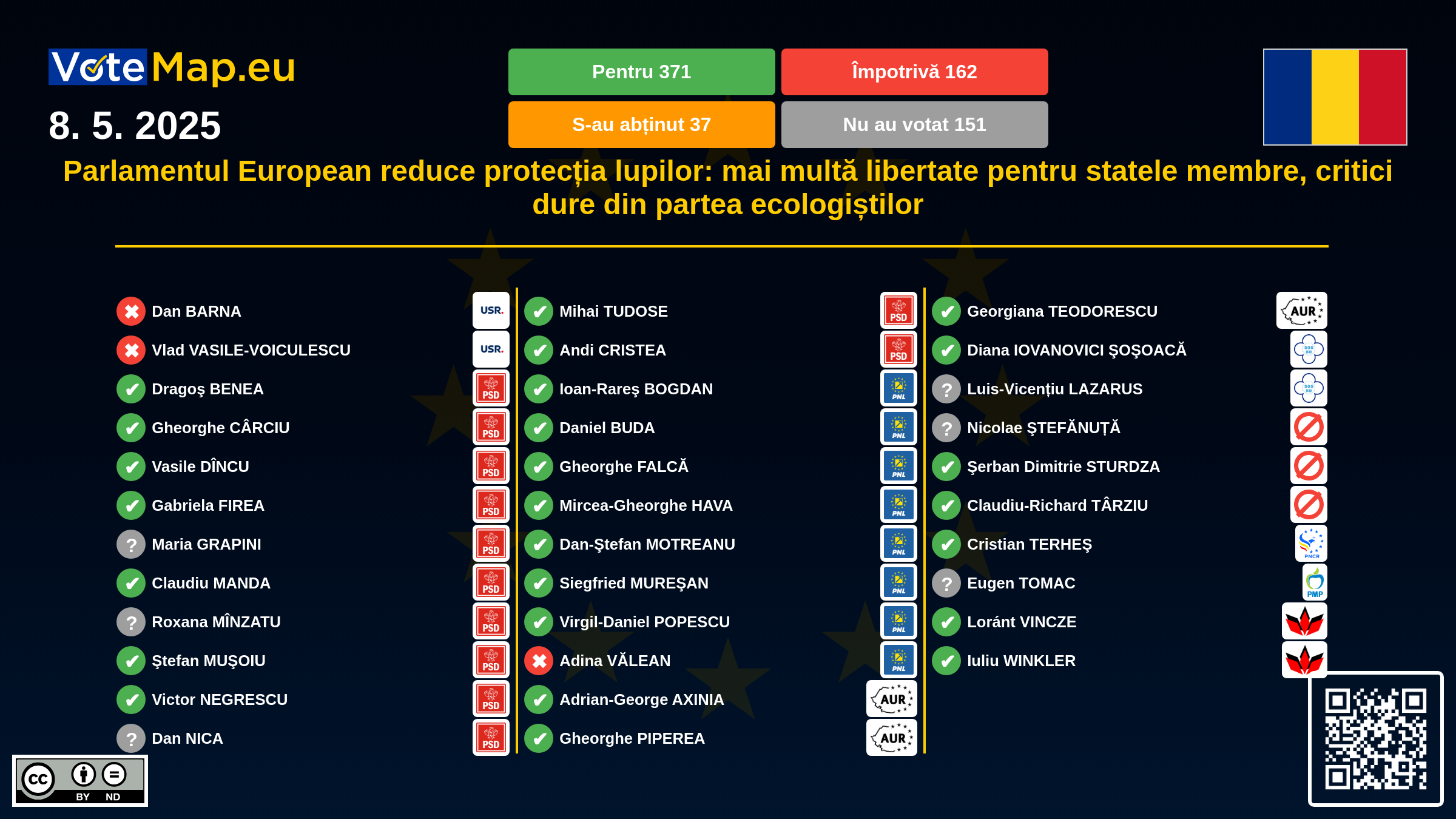 Parlamentul European aprobă schimbarea statutului de protecție al lupului din "strict protejat" în "protejat". Măsura este menită să permită statelor membre o mai mare flexibilitate în gestionarea populațiilor de lupi, dar a atras critici puternice din partea organizațiilor de mediu.