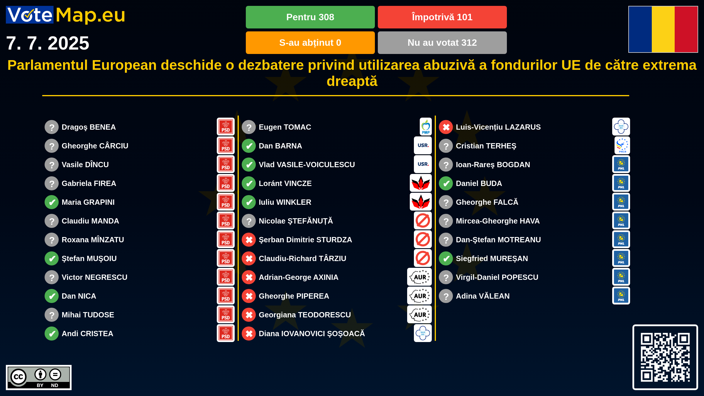 We collect and visually present data publicly available at the page of European Parliament. Votemap.eu denies any responsibility for possible inconsistencies of the data or its changes after the publication.